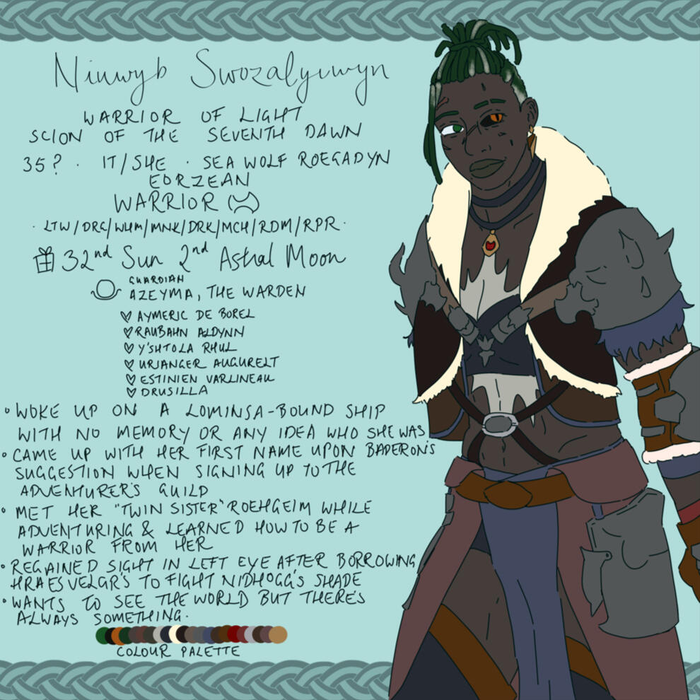 The current Warrior of Light, Niuwyb was pieced together and formed from parts of the previous four Warriors of Light's souls by Hydaelyn after they perished during the Calamity. Thrown into the world with no memories or any identity, she was sent in the direction of the adventurer's guild, where Baderon jokingly suggested she take on the name Niuwyb, meaning "new woman". Not really having anything else to go by and seeing the humour in his joke, she went with it.