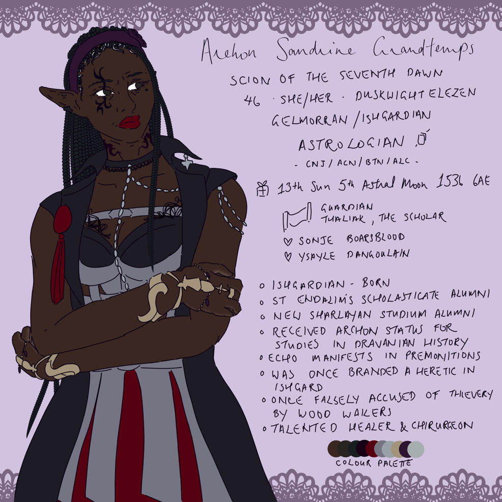 Born to a Gelmorran servant in Ishgard, Sandrine lucked out and got a recommendation to study at Saint Endalim’s Scholasticate in her youth. She left Ishgard for Sharalyan in the Dravanian Hinterlands only a couple years after, finding the Scholasticate biased and lacking. The same year she achieves archon status for her research into Dravanian and Ishgardian history, her mother is tried for heresy, and she finds herself accused of the same, and is unable to return to Ishgard. When Dravanian Sharalyan is abandoned, rather than travel to Old Sharalyan with the other scholars, Sandrine elects to travel around Vylbrand. Throughout her travels she learns many schools of magic, having an affinity for the manipulation of aether, supplemented by her echo. Upon using her newly learnt skills in conjury to save Sonje Boarsblood, an Ala Mhigan refugee, she pledges to protect Sandrine, and the two become travelling companions. The two follow Sandrine’s echo of premonition, finding themselves in Dravania once more. When Sandrine has a vivid premonition of a woman falling from the sky, she manages to enlist the help of the dragon Vidofnir, and they arrive just in time to catch a falling, near-death Ysayle Dangoulain.