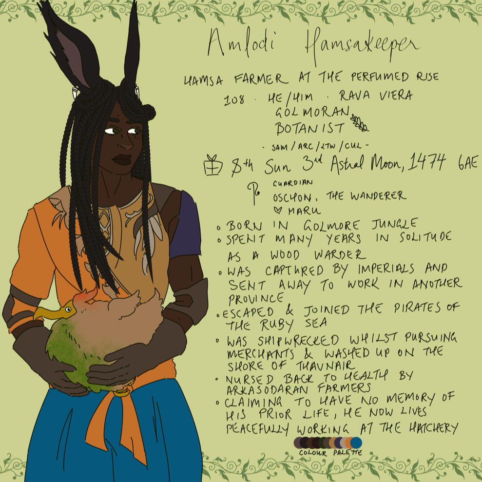 A viera that washed up on the shores of Thavnair, and upon awakening, claimed to have lost his memory. With nothing but clothes and a doman sword to his name, he was taken in by Arkasodaran farmers, and soon adapted to their lifestyle. These days, he can be found tending to his hamsa or working on rebuilding the hatchery after the damage done during the Final Days.