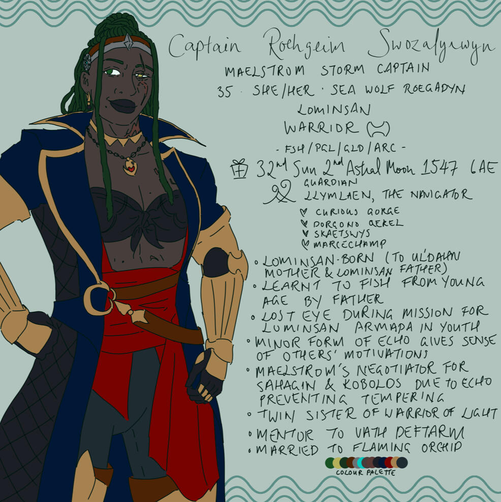 Storm Captain, skilled warrior, master angler, and part-time adventurer - Roehgeim has seen much in her thirty-five years (despite having lost sight in one eye in her youth.) Daughter of a Lominsan sea wolf fisherman and an Ul’dahn hellsguard adventurer, Roehgeim picked up skills from both her parents, joined the Marauder’s guild as soon as she was old enough, and carved a name for herself with her battleaxe. While she has a gift of the echo, Roehgeim is not a member of the Scions of the Seventh Dawn like her twin sister, Niuwyb, or her wife, Flaming Orchid; opting instead to use her ability to work more closely with the Sahagin and Kobolds than one vulnerable to tempering would be able to. She still assists the Scions when needed.