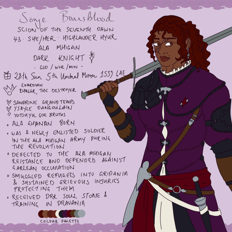An Ala Mhigan refugee that had fled into Gridania, Sonje was found unconscious and near death by a duskwight conjurer who saved her life. Feeling indebt to her saviour, she decided to dedicate herself to protecting her. When the conjurer grew weary of the ways of the Shroud, Sonje followed her to Vylbrand; when the conjurer felt need to return home, Sonje followed her to Coerthas; when the conjurer was scorned by her homeland, Sonje followed her to Dravania; when the conjurer caught wind of tragedy about to strike, Sonje took to the skies with her and caught the falling snow. And when the war in the conjurer's homeland was finally brought to an end, Sonje was reminded of her own home long lost. And so she returned to Ala Mhigo with her two companions and she saw peace returned to her own homeland, too.
