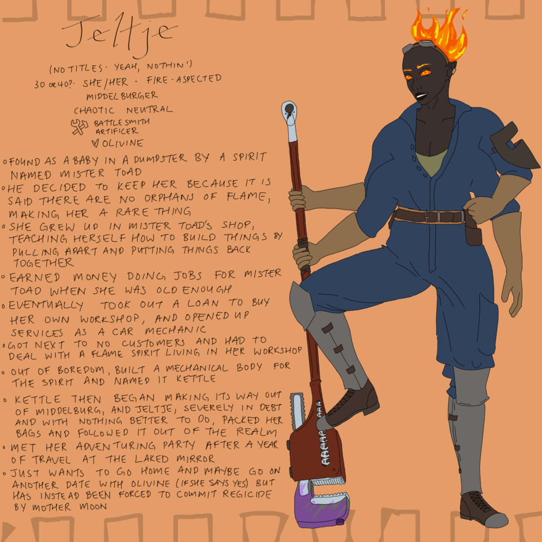 She’s a car mechanic. she’s 1950 gold in debt. she has a mortgage. she’s terrible at customer service. she has 8 charisma. she’s a loser. she’s an orphan of flame. she was raised by a toad. she built a body for a spirit that was haunting her workshop. she’s an asshole. she’s butch. she’s scared of water. she’s thirty or forty years old. she can make a good meal out of strawberries and giant bugs. she made a giant pipe wrench to inflict violence on things as a coping mechanism. she’s bisexual. she has the ability to consume lactose. she got deported because she’s owned by a toad. she makes healing balms out of grease and engine oil. she drinks custard out of a mug. she got told she was bad at sex by a fox spirit. she’s greedy. she’ll do the opposite of what you advise her to out of spite. she's possessed. she has to commit regicide. she won a baking competition because her friend sabotaged the other contestants without her knowledge. she's in love with a tall femme that's out of her league.